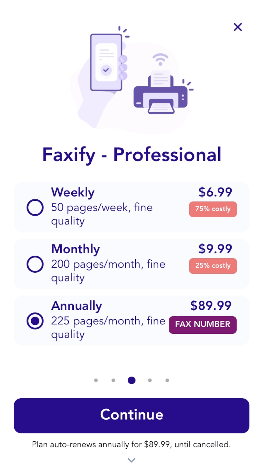 Currently, we do not offer a single-purchase choice. However, you're encouraged to explore the app and make use of the complimentary option allowing 5 pages per month, without the need for a subscription. If your faxing needs exceed this limit, you can opt for the standard plan priced at 4.99/week. You can send your faxes under this plan and then promptly terminate the recurring subscription by following the instructions detailed in this FAQ section.